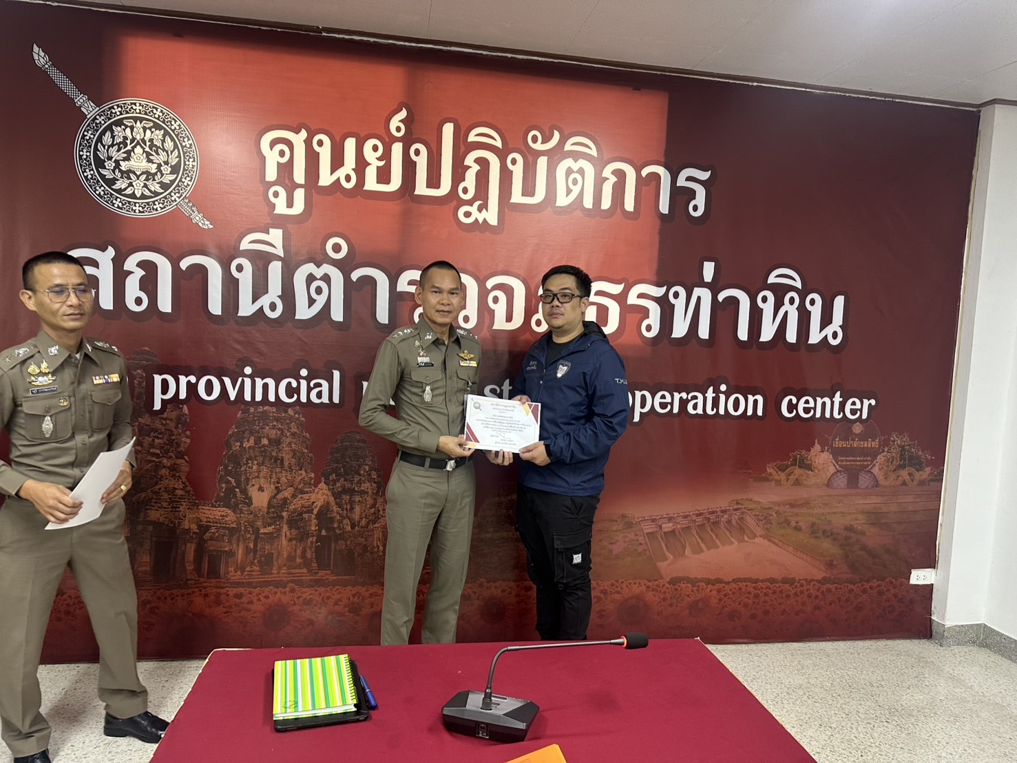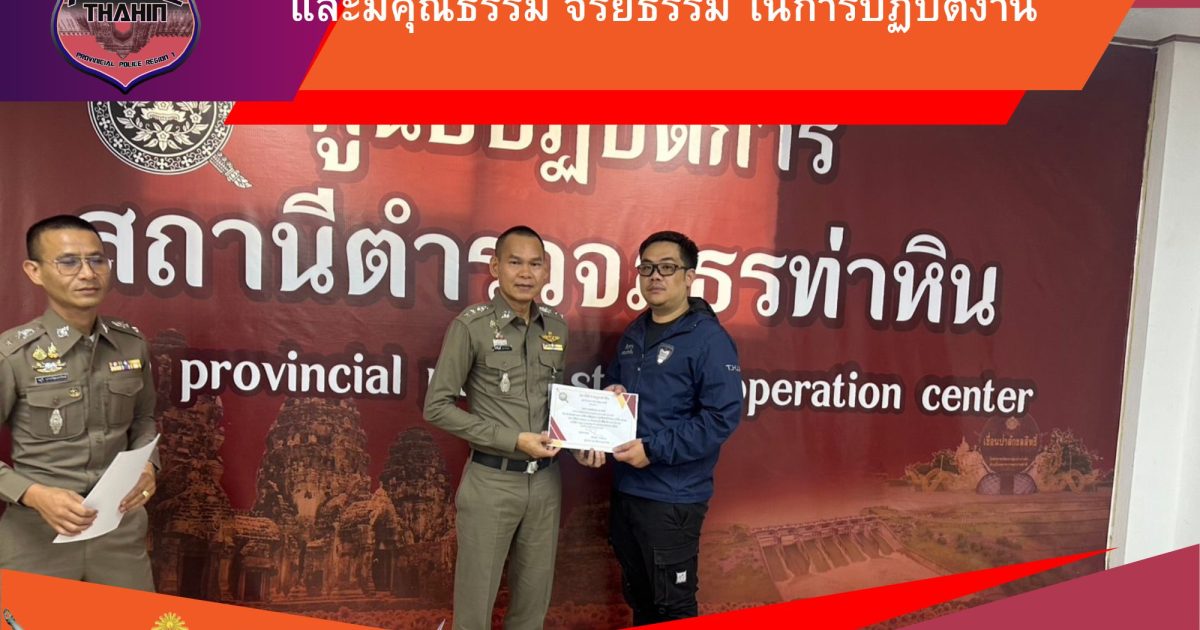 วันที่ 18 กุมภาพันธ์ 2568 พ.ต.อ.ทัชวัฒน์ สายโยธา ผกก.สภ.ท่าหิน, พ.ต.ท.พันธ์ศักย์ ขาวงาม รอง ผกก.ป.สภ.ท่าหิน, พ.ต.ท.วสุวี ปวรวัฒนทรัพย์ สว.อก.สภ.ท่าหิน และข้าราชการตำรวจ พิธีมอบใบประกาศเชิดชูเกียรติแก่ข้าราชการตำรวจเพื่อเป็นแบบอย่างที่ดี (ดาวคุณธรรม) และปฏิบัติงานด้วยความโปร่งใส เป็นธรรม ไม่คำนึงถึงประโยชน์ส่วนตน แต่คำนึงถึงประโยชน์ส่วนรวม ของประชาชน และสังคม เพื่อเสริมสร้างคุณธรรม และความโปร่งใน การต่อต้านการทุจริต ต่อต้านการรับสินบน ในหน่วยงาน ณ สภ.ท่าหิน